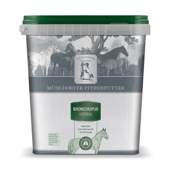 Mühldorfer Bronchopur herbal ist ein Ergänzungsfutter aus wohltuenden Kräutern, das bei Husten auf natürliche Art und Weise den Schleimhäuten der Atemwege hilft und so Wohlbefinden und Leistungsbereitschaft Ihres Pferdes steigert.