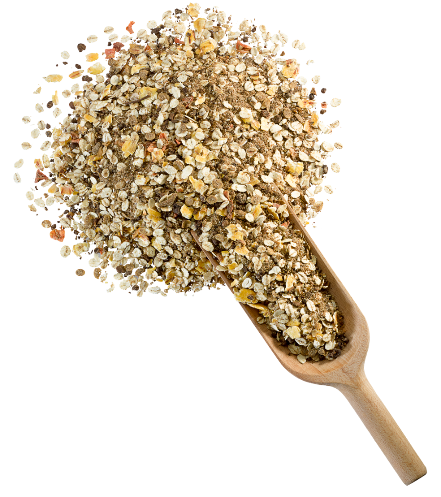 Gerstenflocken, Maisflocken (aufgeschl.), 15% Apfeltrester, Weizenkleie, Leinsaat (extr.), Gerste, 3% Karotte (getr., gewürfelt), Zuckerrohrmelasse, Hefe, Leinöl, Natriumbicarbonat, Johannisbrot (getr., gemahlen)