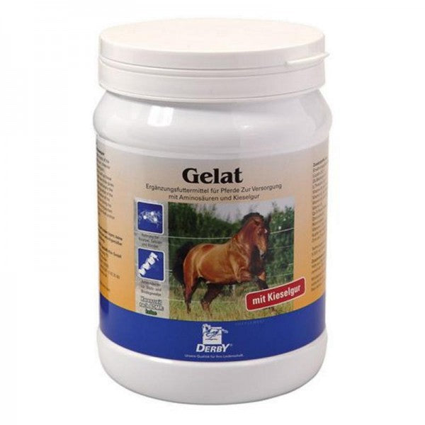 Derby Gelat dient der gezielten Versorgung des Pferdes mit den lebenswichtigen Aminosäuren Lysin, Threonin und Methionin in Verbindung mit Kieselgur. Aminosäuren und Kieselgur werden vom Körper benötigt, um Gewebe aller Art aufzubauen, wie beispielsweise Kollagenfasern der Sehnen und Bänder. Mangelsituationen, die durch DERBY Gelat ausgeglichen werden können, entstehen beispielsweise im Wachstum oder bei besonderen Belastungen des Bewegungsapparates durch Arbeit, Verletzung oder Korrektur der Hufstellung.