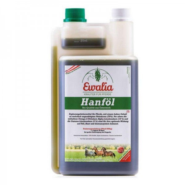 Ewalia Hanföl ist ein Ergänzungsfutter für Pferde, mit hohem Gehalt an mehrfach ungesättigten Fettsäuren und Omega-3-Fettsäuren, diese können für ein glänzendes Fell und ein optimales Immunsystem sorgen.