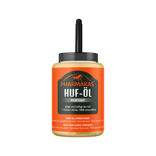 Huf-Öl Kräftiger pflegt den Huf auf besondere Weise, indem es von Hornmasse aufgenommen wird und daher nicht die Hufporen verstopft. Huf-Öl Kräftiger wirkt durch seine besonderen Inhaltsstoffe, reinem Pflanzenöl und täglicher Anwendung positiv und kräftigt die Hufe. Es schützt vor losen Hufwänden, Strahlfäule und die Eisen halten länger.