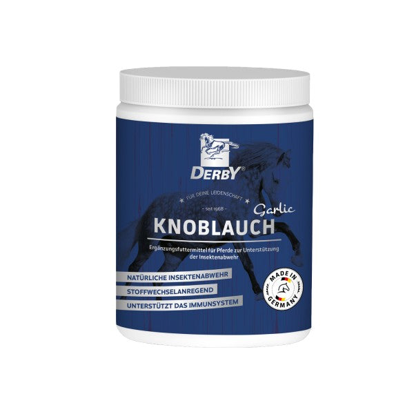 Derby Knoblauch ist ein Ergänzungsfutter für Pferde, mit natürlichem Knoblauch und zusätzlichen B-Vitaminen. Knoblauch wehrt lästige Fliegen und Insekten ab. Zusätzlich wird dem Knoblauch eine keimtötende und entzündungshemmende Wirkung nachgesagt. Zudem sorgt Knoblauch auf vielfältige Weise für eine Anregung des Kreislaufes und verbessert die Fließfähigkeit des Blutes.