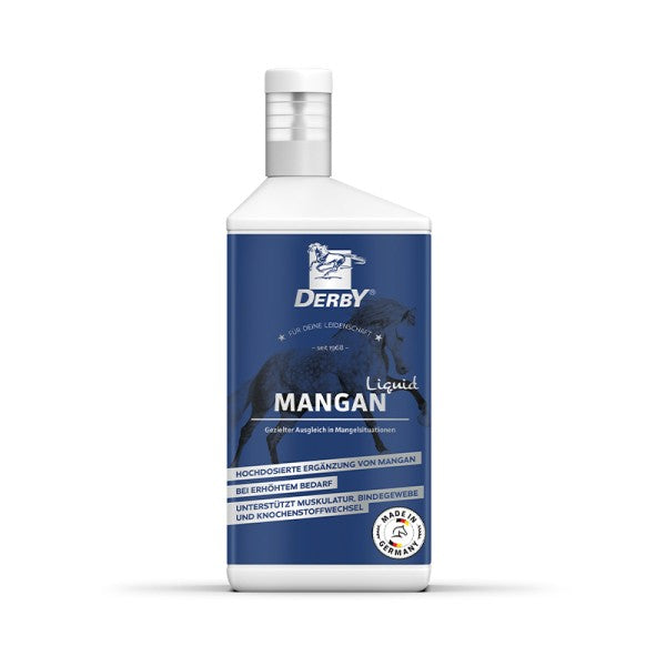 Derby Mangan Liquid ist ein flüssiges Ergänzungsfutter zur gezielten Optimierung der Futterration bei Manganmangel. Durch die flüssige Darreichungsform ist die Dosierung sehr einfach und genau möglich. Das Liquid kann den Knochenstoffwechsel, das Bindegewebe und die Muskulatur unterstützen. Durch seinen niedrigen Zuckergehalt ist es auch für Pferde mit Stoffwechselstörungen wie ECS oder PSSM / MiM geeignet.