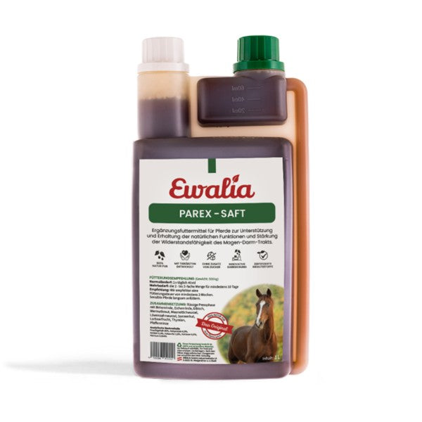 Ewalia Parex-Saft ist ein Ergänzungsfutter für Pferde, das die natürliche Verdauungsfunktion unterstützt und einen widerstandsfähigen Magen-Darm-Trakt fördert. Der aus anerkannten Heilkräutern extrahierte Kräutersaft ist frei von chemischen Konservierungsmitteln und anderen Zusatzstoffen und kann zum allgemeinen Wohlbefindend beitragen.