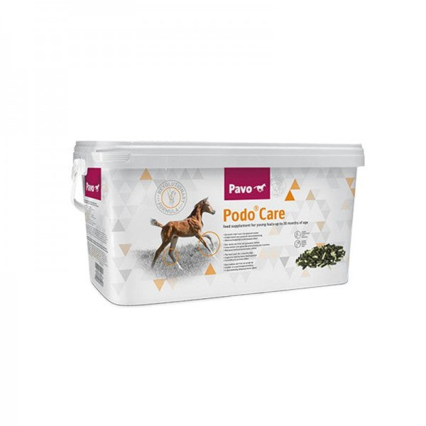 Pavo Podo Care liefert alle Vitamine, Mineralstoffe und Spurenelemente für Fohlen und heranwachsende Pferde sowie tragende Stuten. Dabei liefert es keine zusätzliche Energie und kein zusätzliches Protein, weshalb es für tragende Stuten ab dem 9. Trächtigkeitsmonat besonders geeignet ist. Es enthält das besondere Podo-Konzept von Pavo, einen einzigartigen Mineralienkomplex, der wissenschaftlich erwiesen die Entwicklung von OC(D) bei jungen Pferden um bis zu 50 % verringern kann. So wird eine optimale Knochenentwicklung im Wachstum optimal unterstützt.