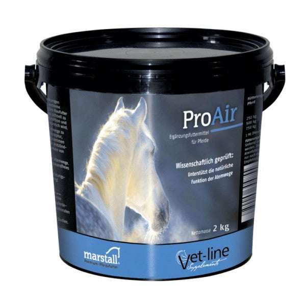 marstall Vet-Linie ProAir ist ein wissenschaftlich geprüftes Ergänzungsfutter für Pferde welches die natürliche Funktion der Atemwege unterstützt. Die wertvollen Inhaltsstoffe können entzündliche Prozesse reduzieren, die mit klinischen Symptomen von Atemwegsbeschwerden einhergehen.